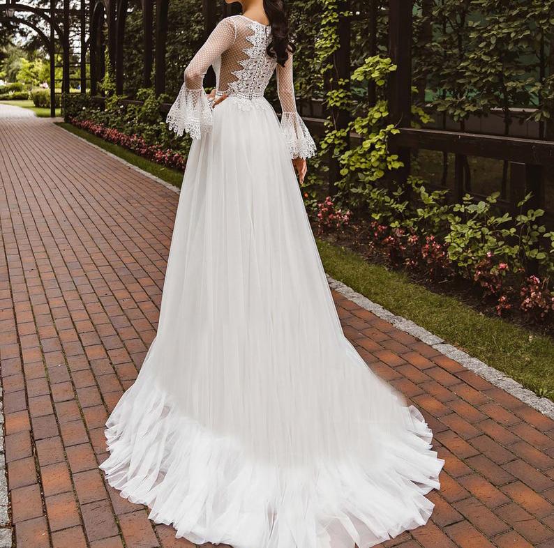 Long Sleeves A Line Wedding Dresses Appliqued Lace Bridal Gown Sexy Illusion Custom Made Sweep Train Boho