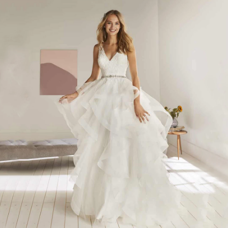 Elegant Ruffles Wedding Dress V Neck Fashion Ruched Tiered Open Back Floor Length A Line Tulle Party Bridal Gown