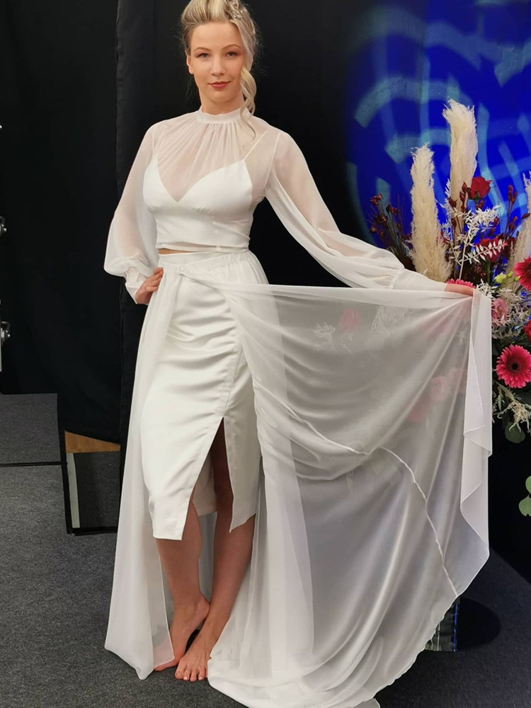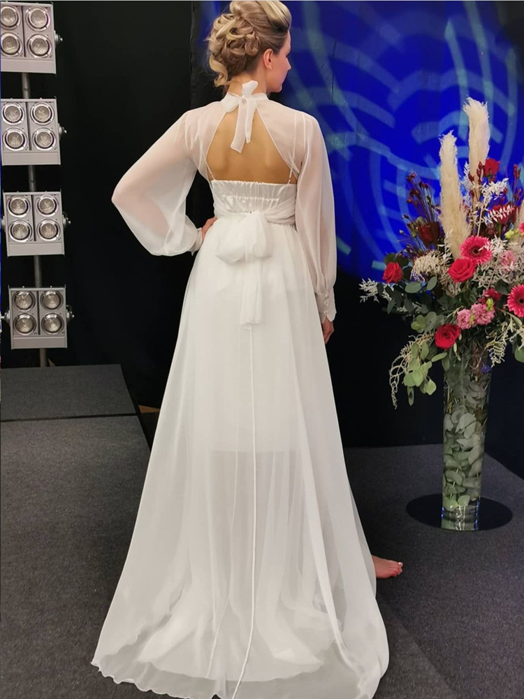 Front Short Long Back Elegant Wedding Dress New Halter A-Line Detachable Train Full Sleeves Backless For Female Bride Gown