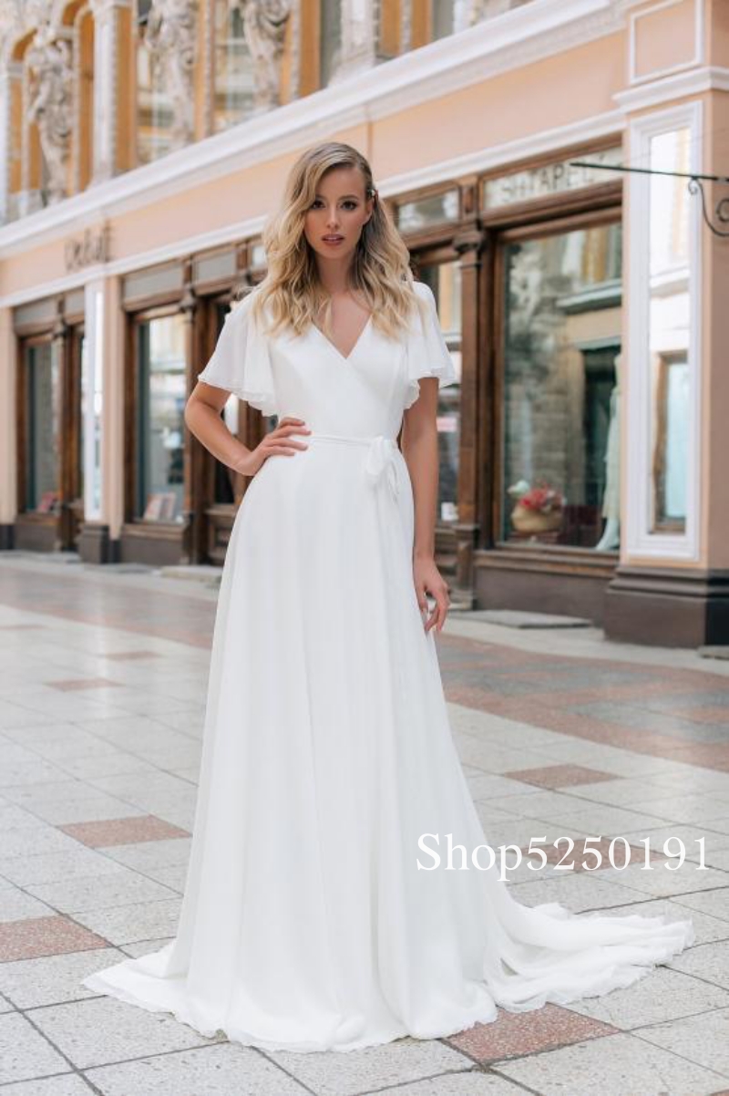 Hot Sale V Neck Chiffon Beach Wedding Dresses Short Sleeve A Line Bridal Gowns