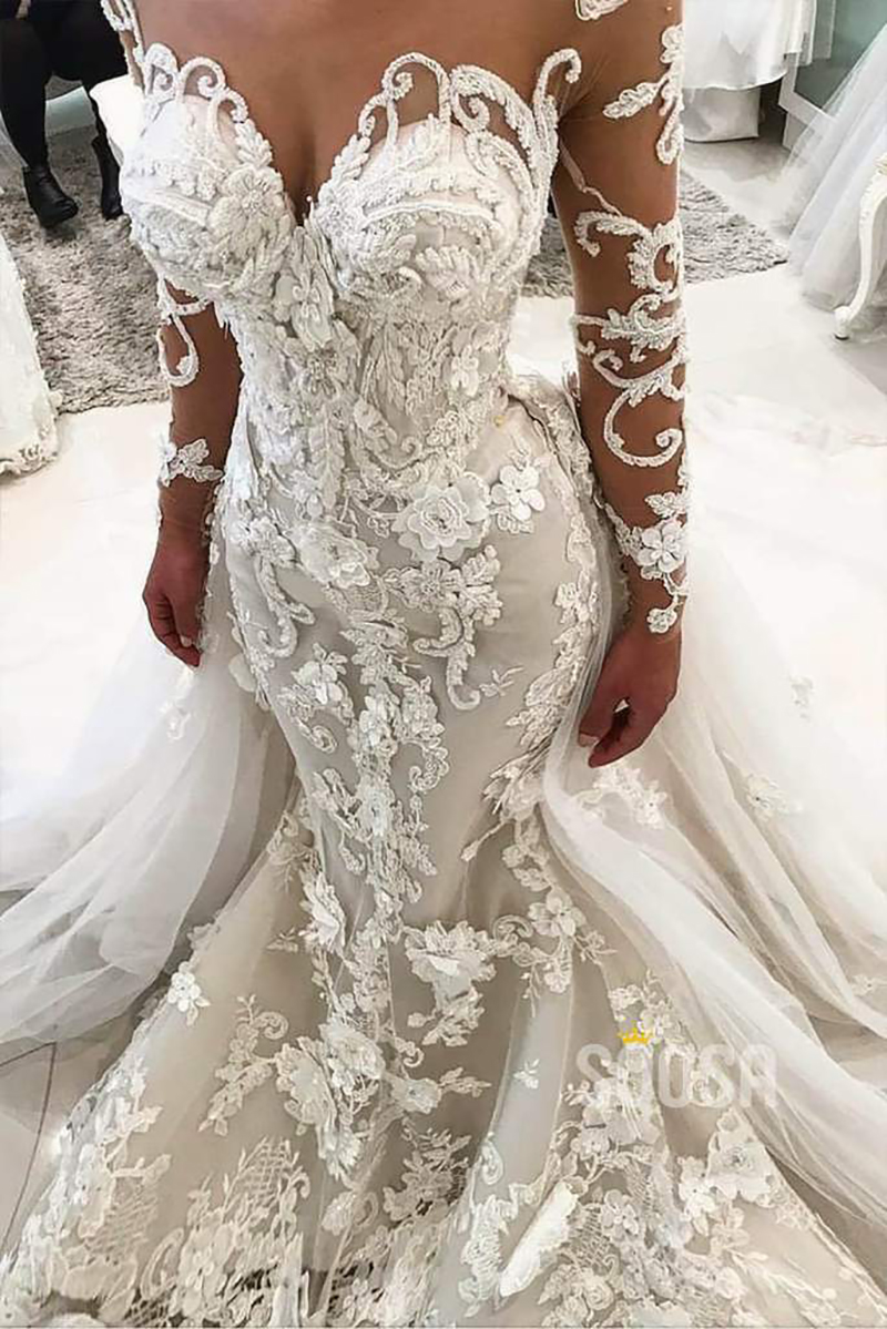 Luxury Wedding Dresses V Neck Long Sleeves Lace Appliques Bridal Gowns Custom Made Button Back Sweep Train Mermaid Wedding Dress