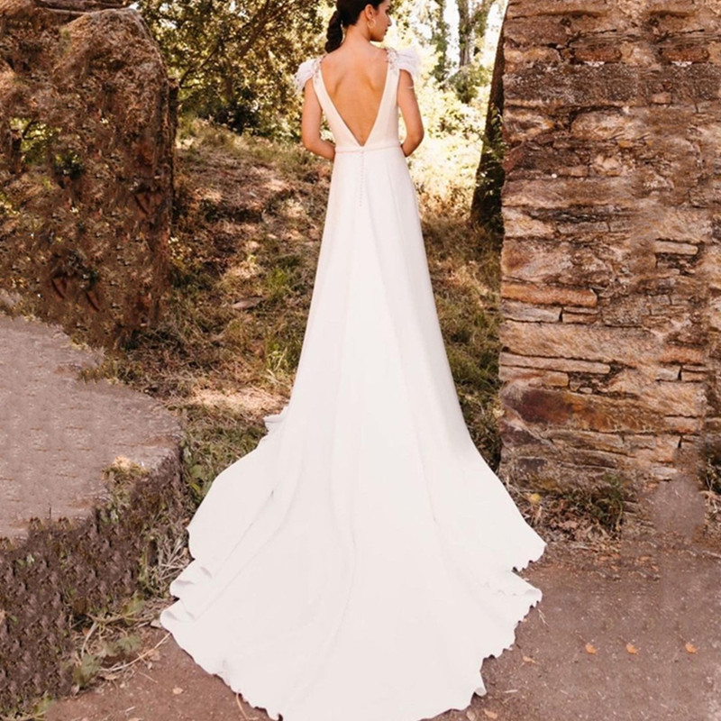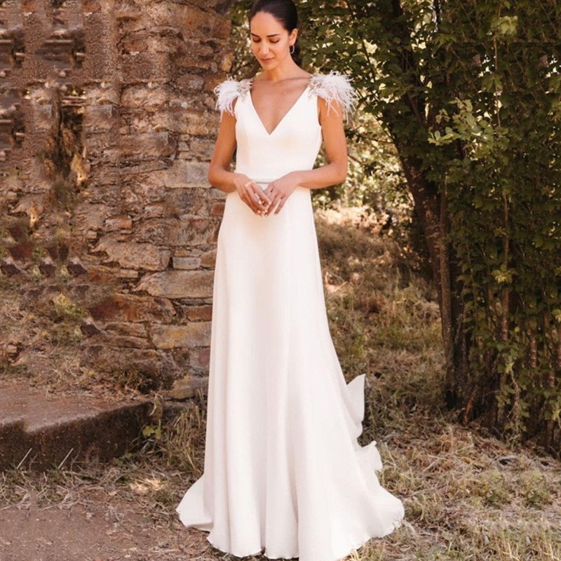 Sexy Elegant Deep V-Neck Wedding Dress Belt Feathers Sleeveless Chapel Train Backless Satin Bride Dress
