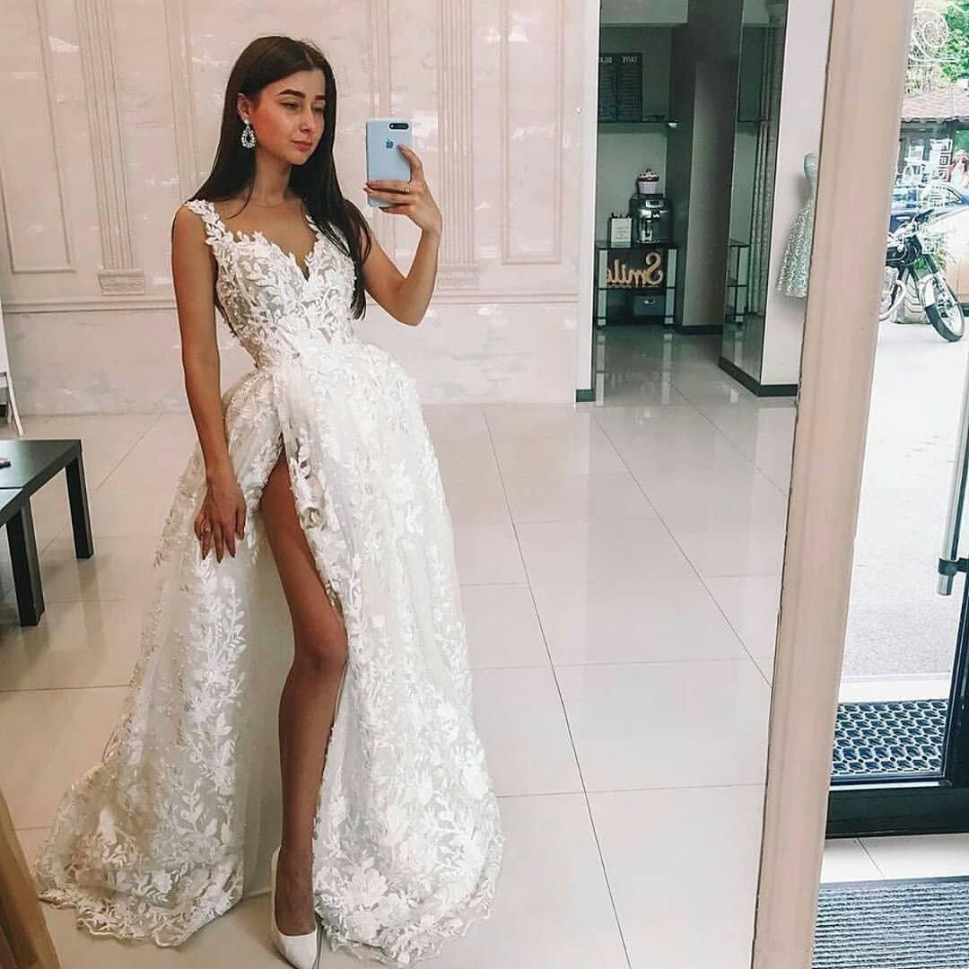 Sexy Lace Beaded Wedding Dresses Sheer Neck High Split Bridal Dresses Vintage Wedding Gowns