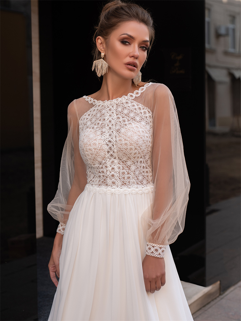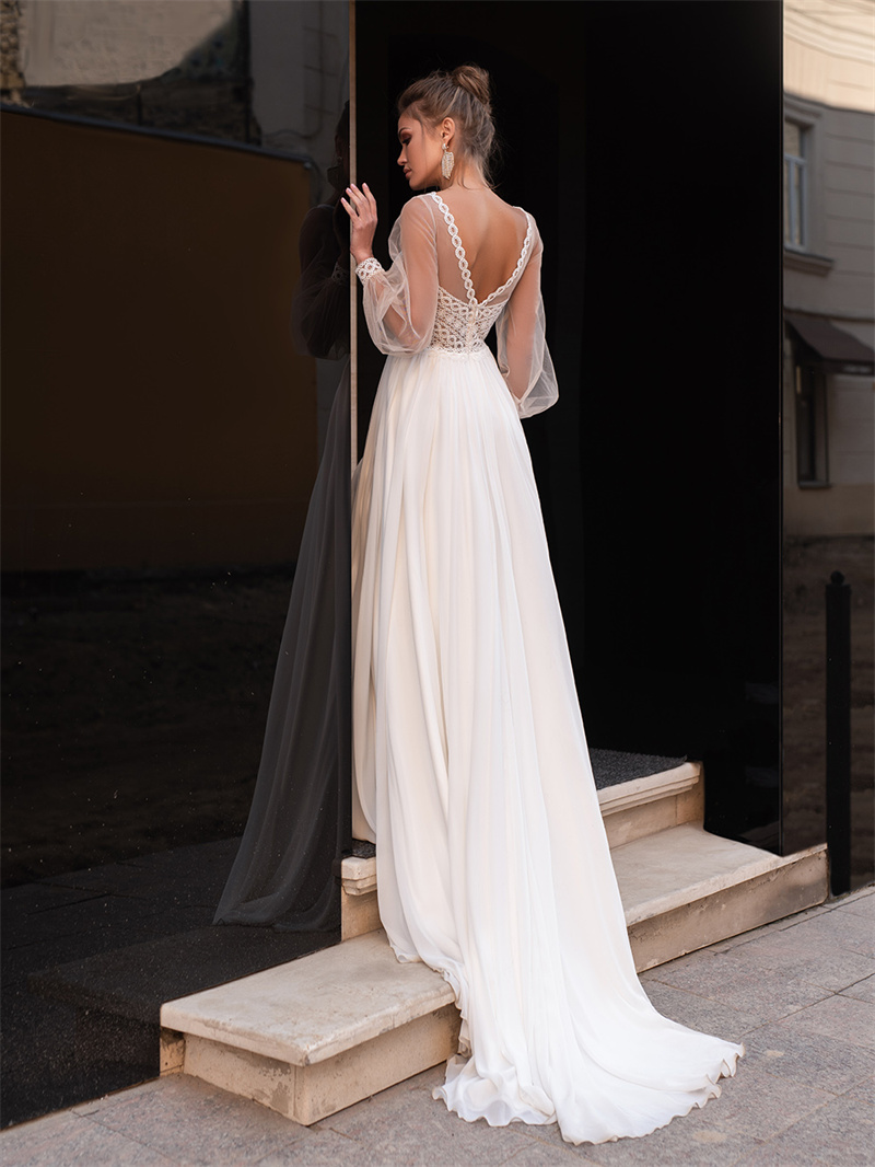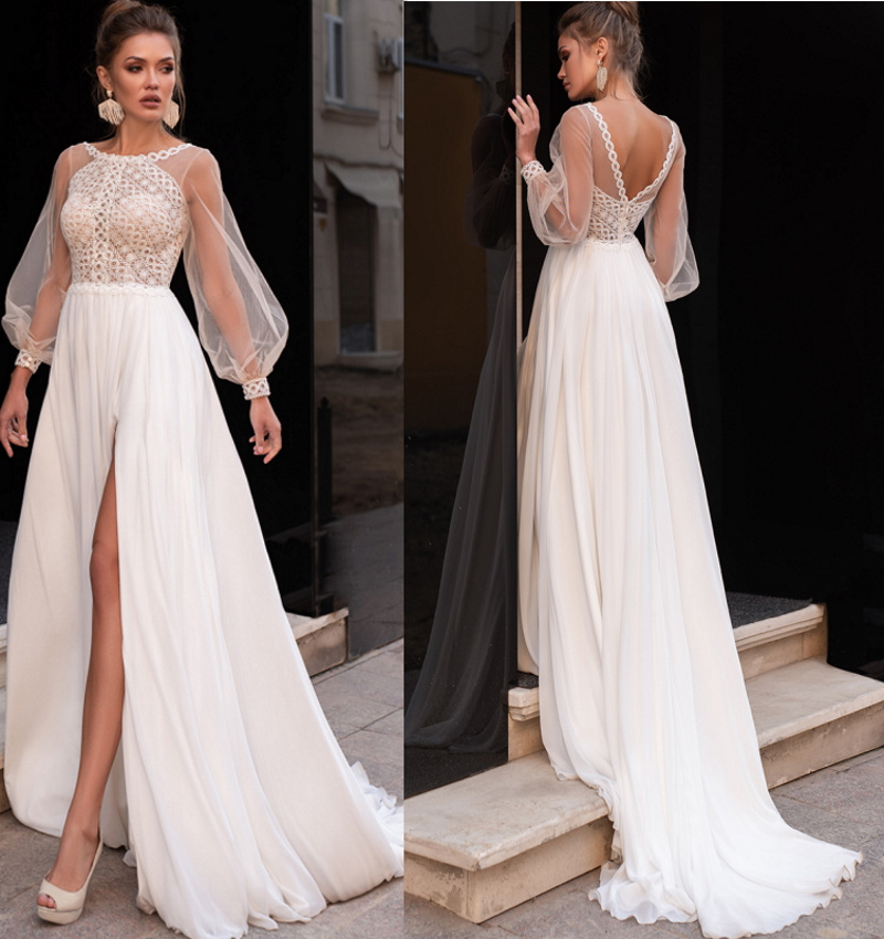 Beach Backless Scoop Chiffon A-Line Puff Sleeve Plus Size High Slit Bohemian Lace Wedding Dress Sweep Train Bride Dress