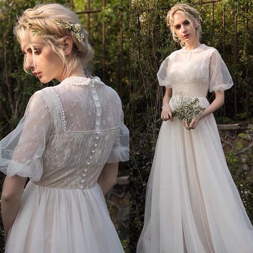 Boho Wedding Dresses A-line Short Sleeves Tulle Lace Pearls Dubai Arabic Wedding Gown Bridal Dress