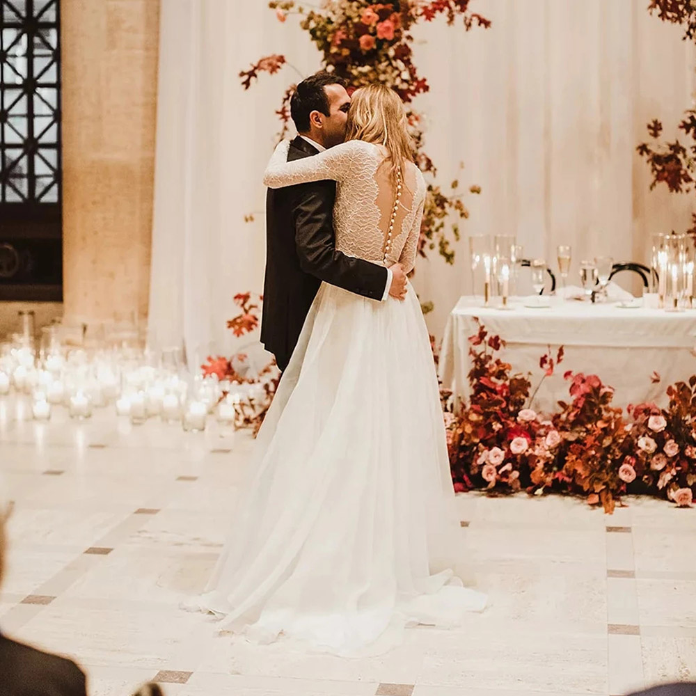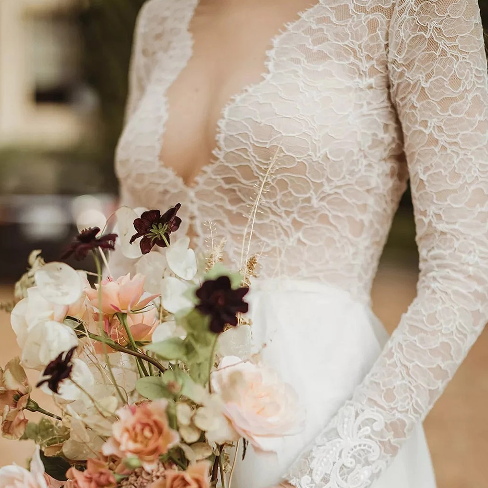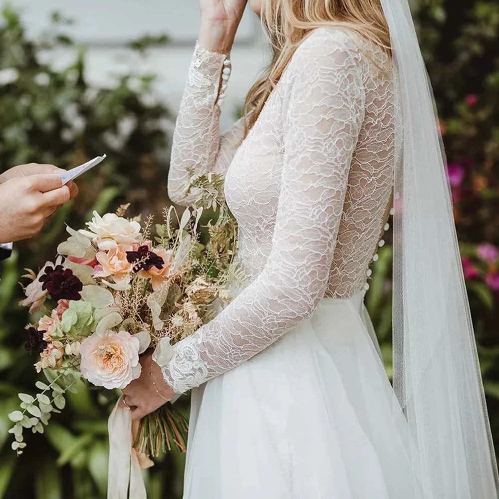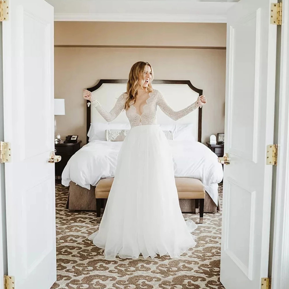 Wedding Dress Long Sleeve Beach V Neck Wedding Gown for Bridal A Line V Neck Button Back with Sweep Train