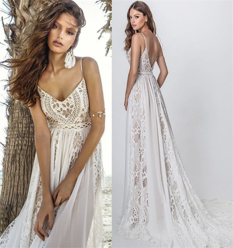 Backless Sexy lace beach bohemian spaghetti straps bridal plus size wedding gown dress