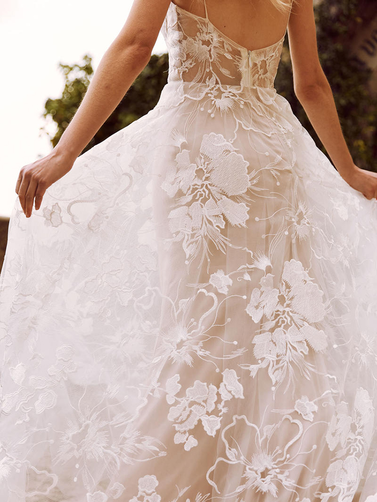 Floral Lace Princess Bride Wedding Dress Luxury V Neck Beach Champagne Spaghetti Straps Sleeveless Open Back Bridal Gowns
