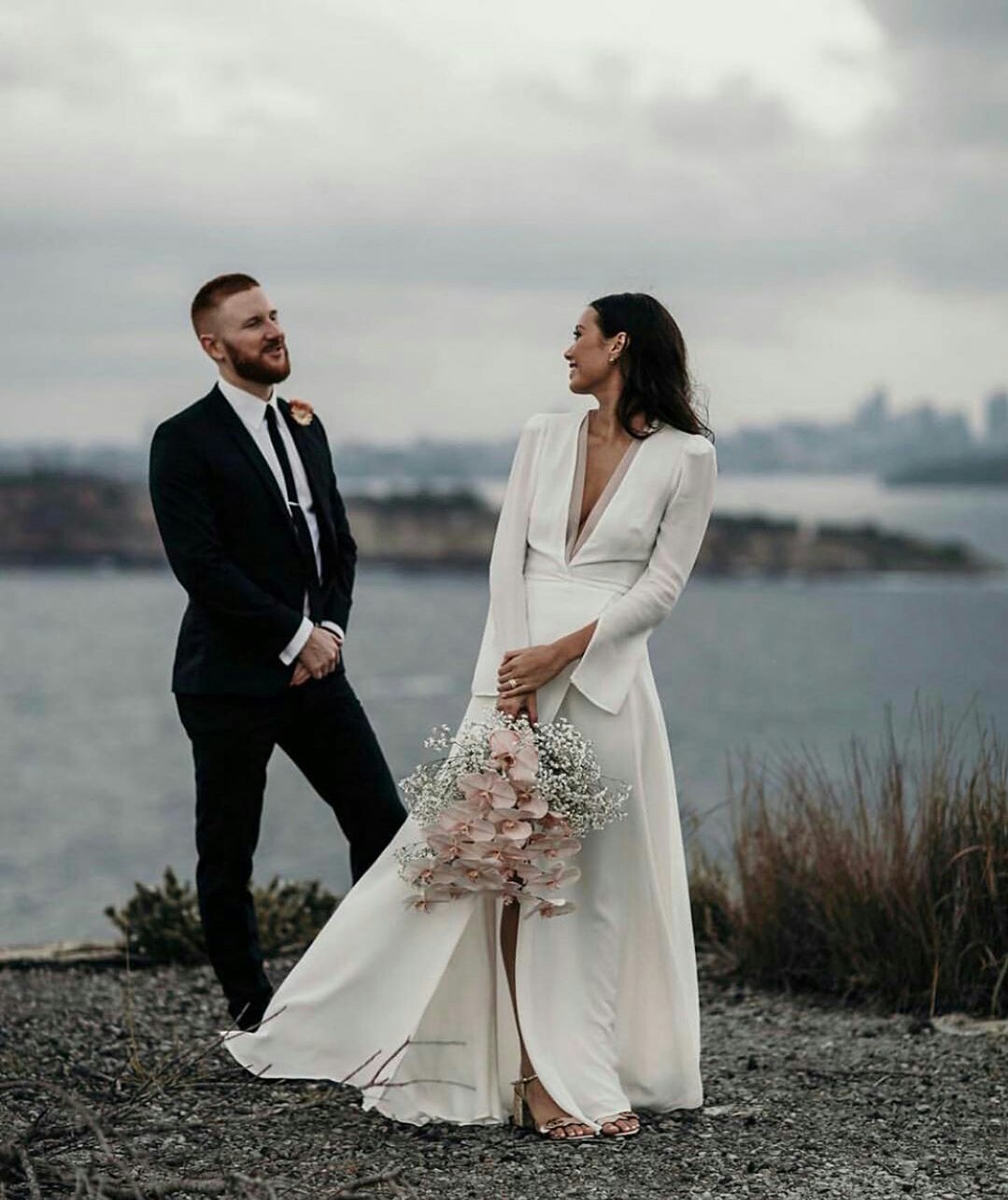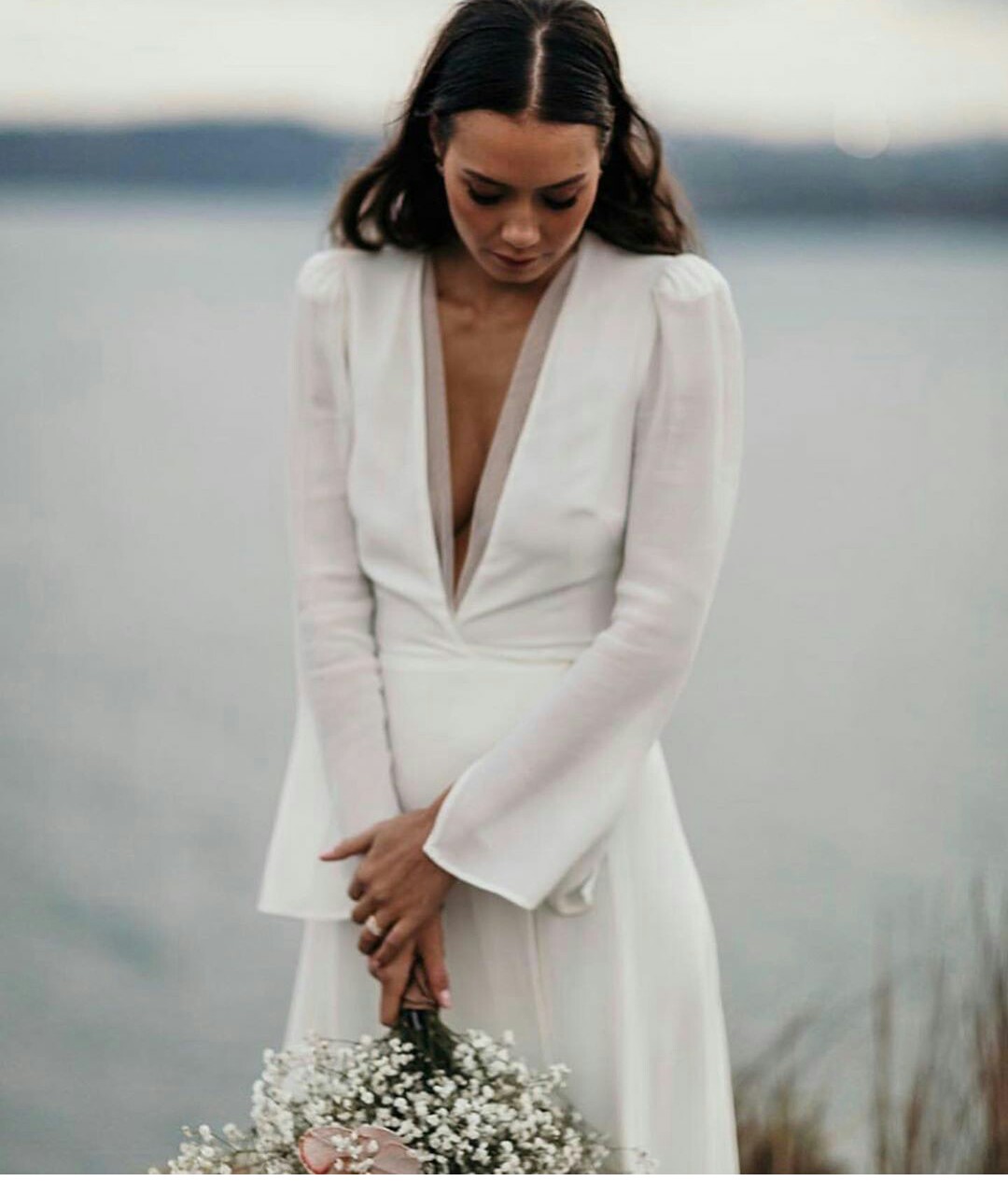 Elegant Bohemian Country Wedding Dresses Deep V Neck Long Sleeve Bridal Gowns Side Split A Line Beach Wedding Gowns