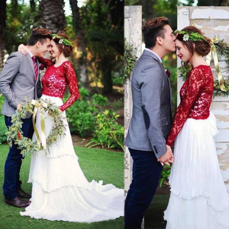 Bohemian Beach Wedding Dresses Chiffon Boho Bridal Gowns Garden Lace Bride Wear Illusion Long Sleeves Wedding Dress