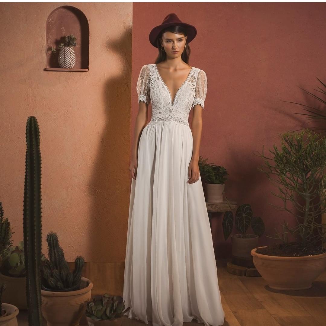 Bohemian Wedding Dress V-Neck Floor Length Short Sleeve Lace Chiffon Bridal Gowns