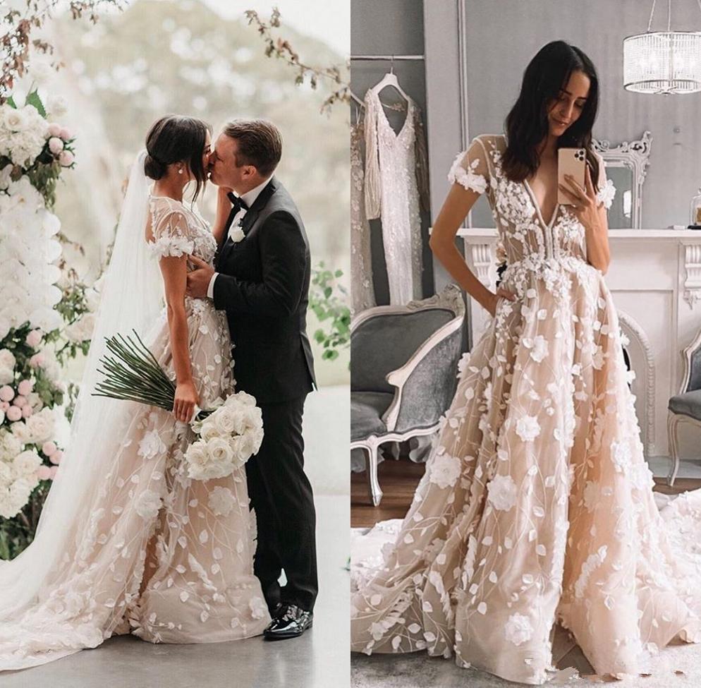 Modern 3D Floral Country Wedding Dresses with Sleeves Berta V-neck Handmade Flowers Bohemian Garden Bride Dress