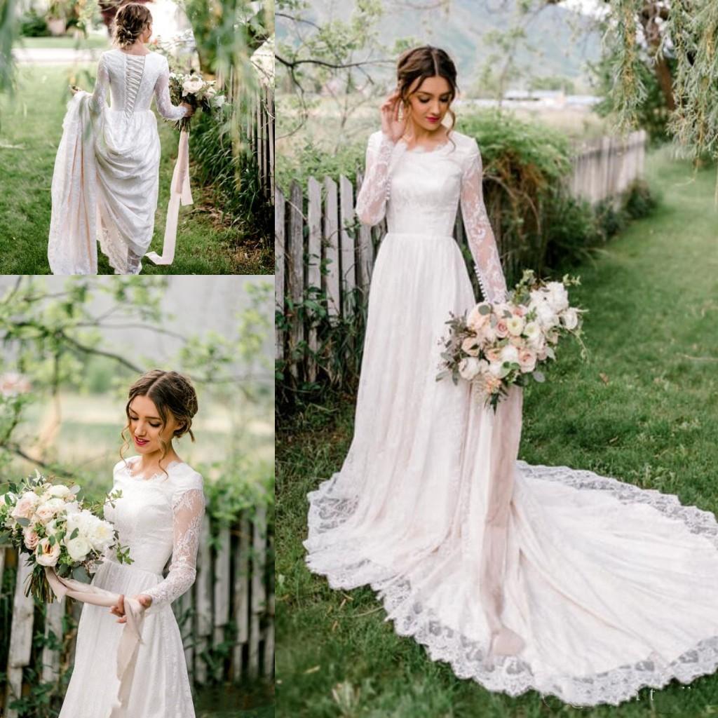Modest lace Wedding Dresses With Sheer Long Sleeves Round Neck Corset lace-up Back bohemian country Bridal Gowns