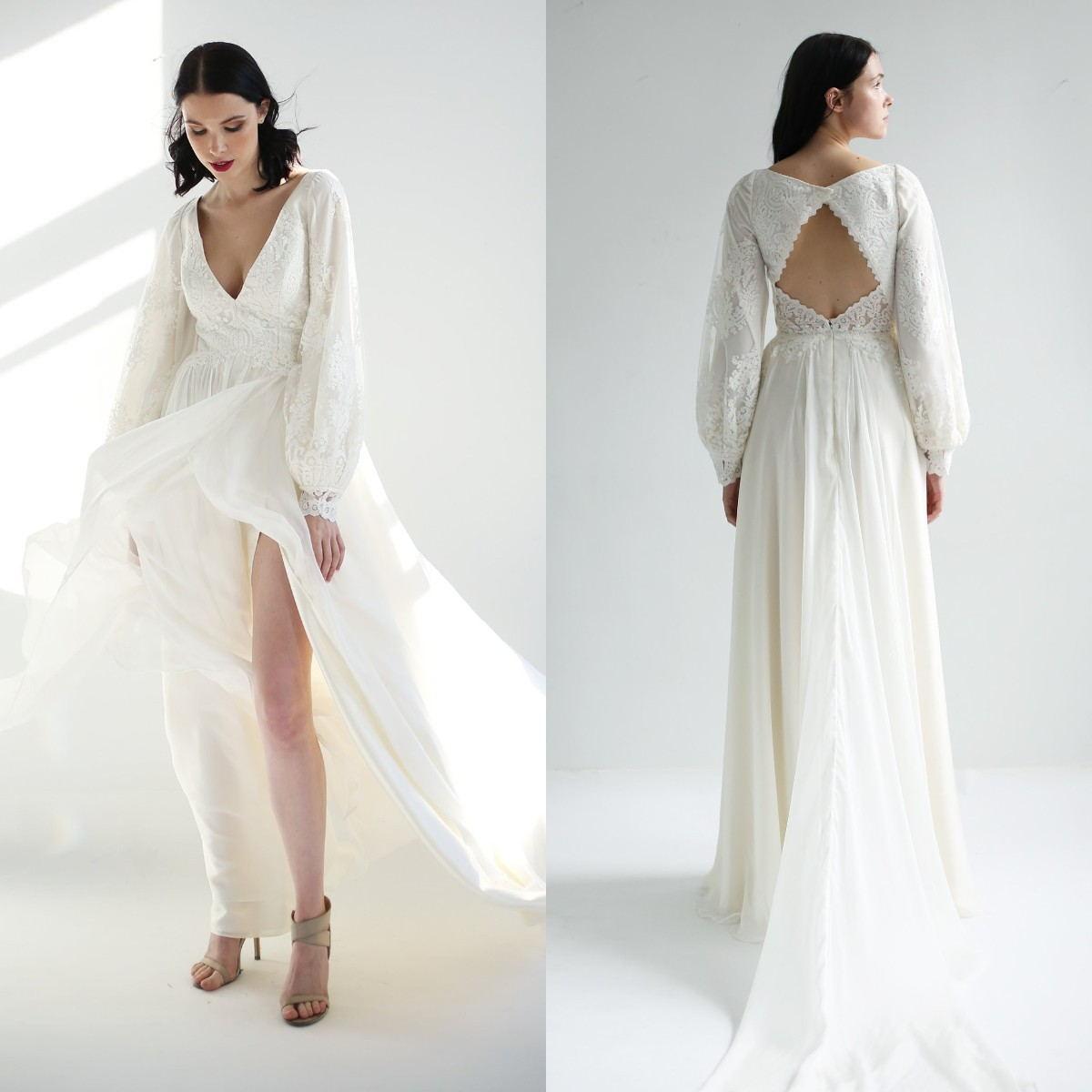 New Bohemian Wedding Dress Deep V Neck A Line Lace Appliqued Boho Robe De Mariée Long Sleeves