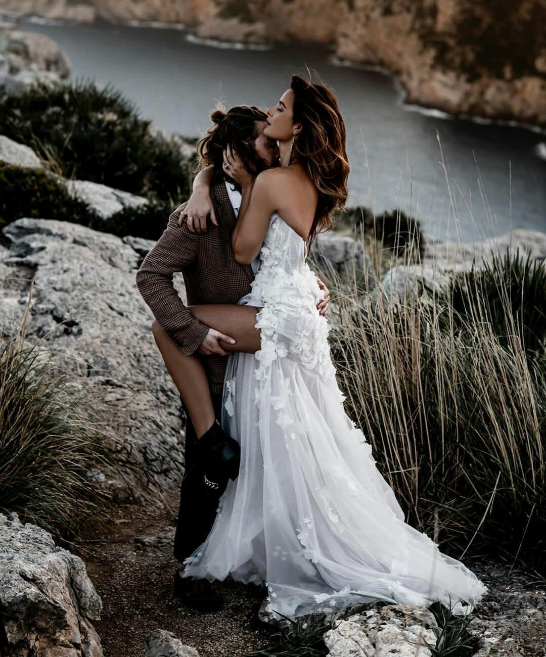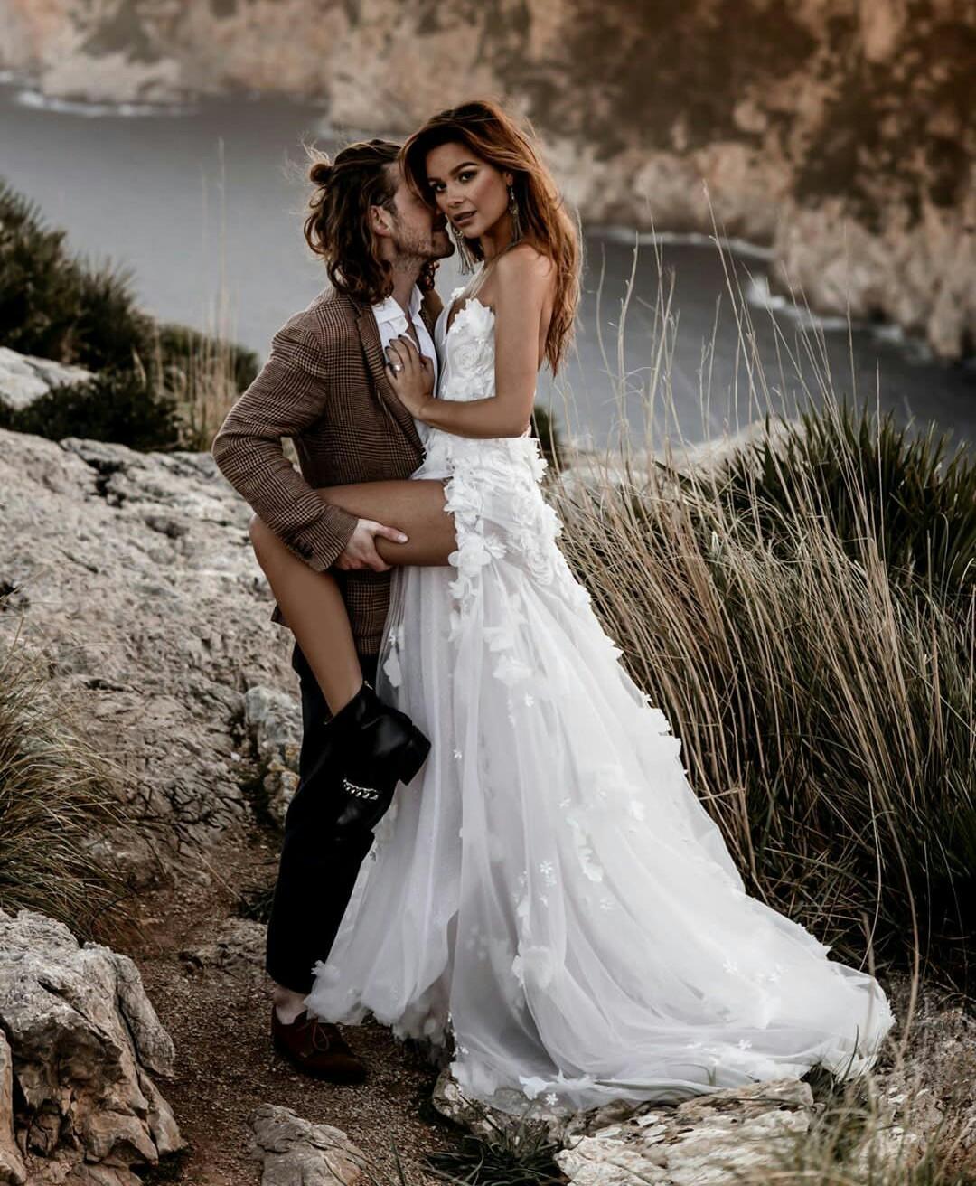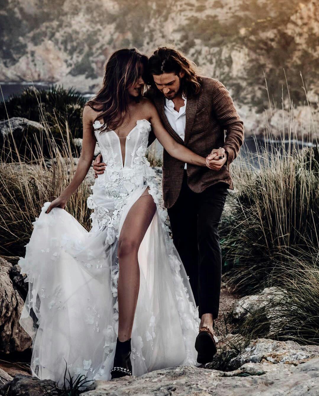 Sexy Bohemian Wedding Dresses Slit Sweetheart Lace 3D Floral Appliques A Line Beach Wedding Dress