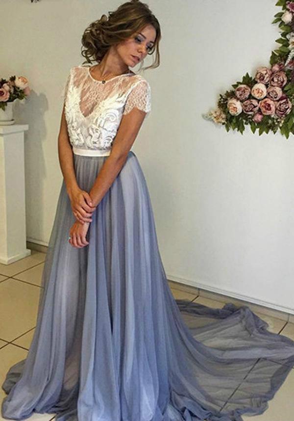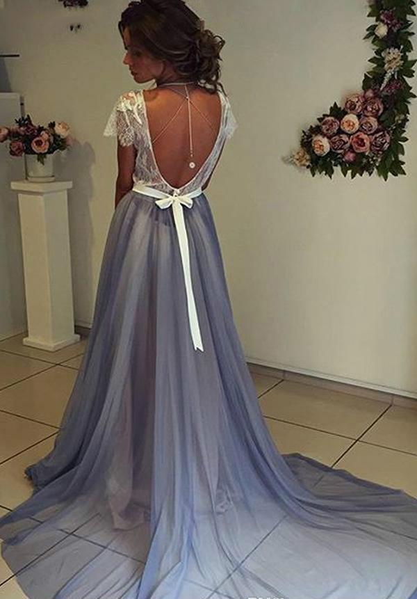 Simple Bohemian A-Line Wedding Dresses Sexy Backless Long Train Beach Boho Bridal Gowns Tops Lace Short Sleeve Bride Engagement Dress