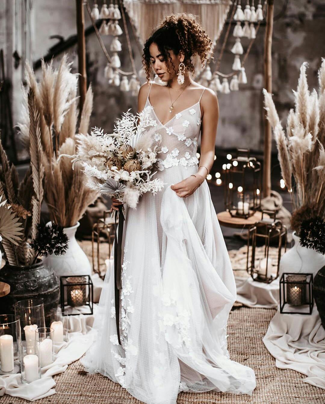 Simple Bohemian Wedding Dresses Spaghetti Tulle Lace Appliqued A Line Beach Wedding Dress