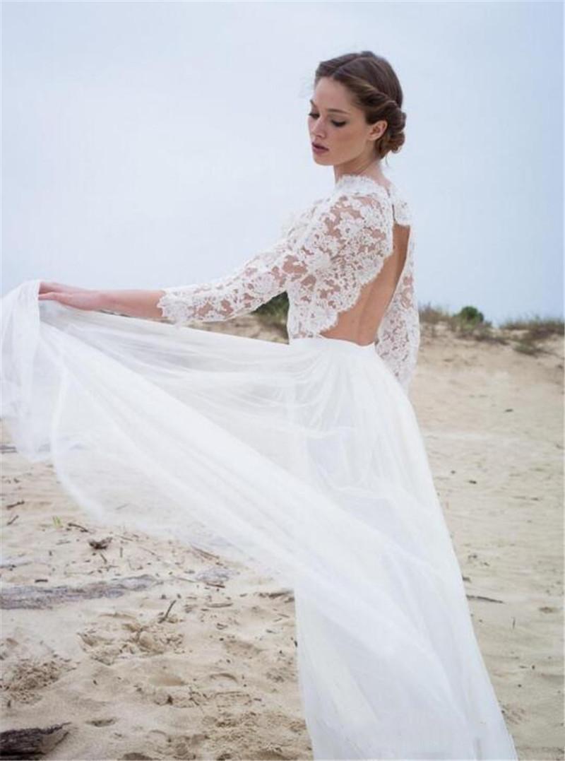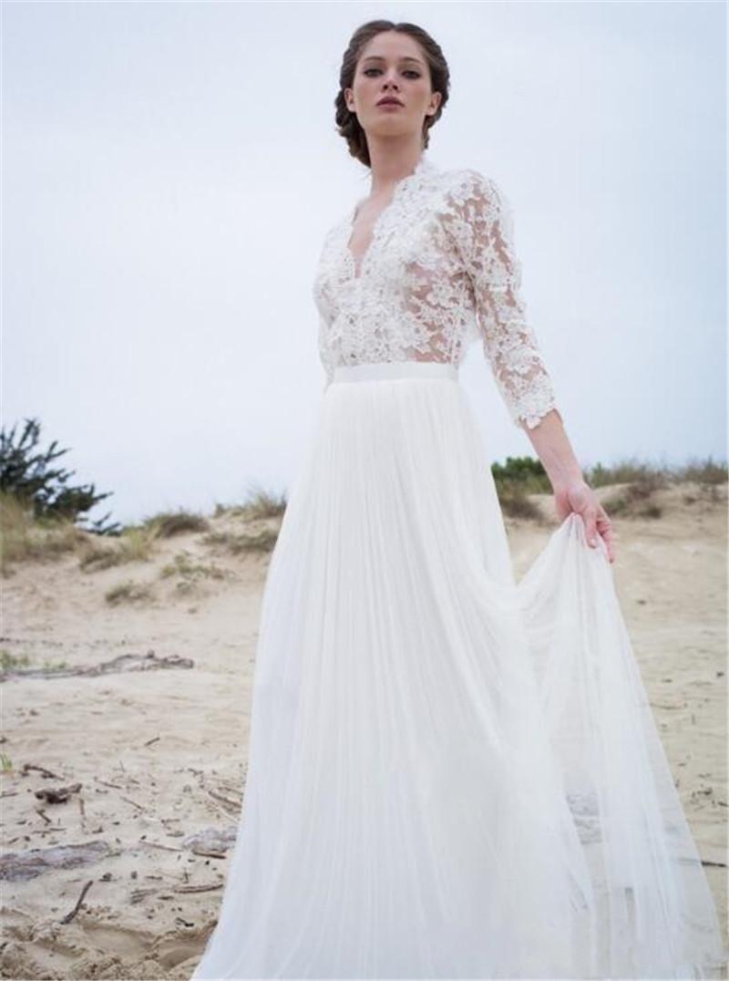Summer Boho Beach Wedding Dresses 3/4 Sleeves V Neck Backless Lace Applique Bohemian Garden Bridal Gowns
