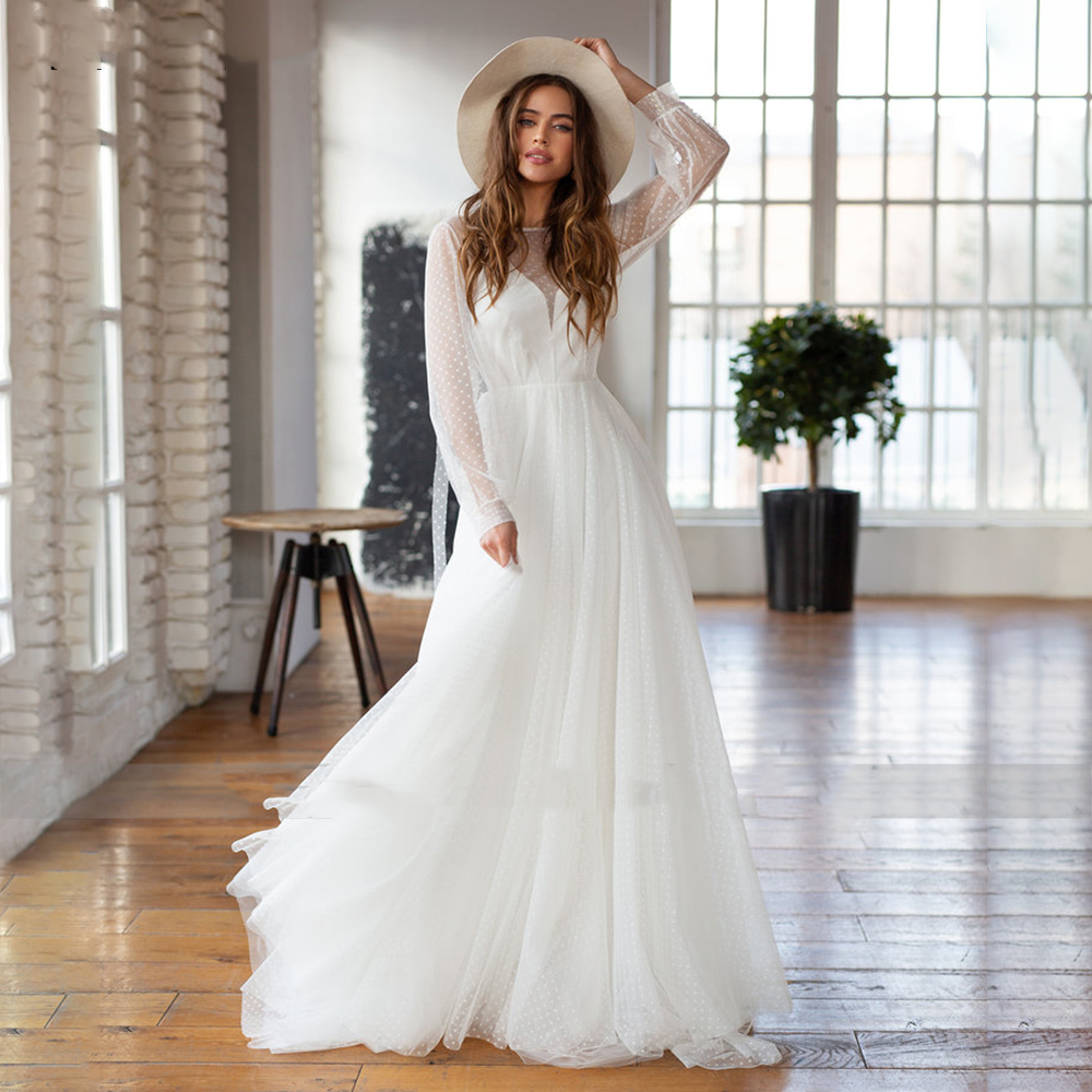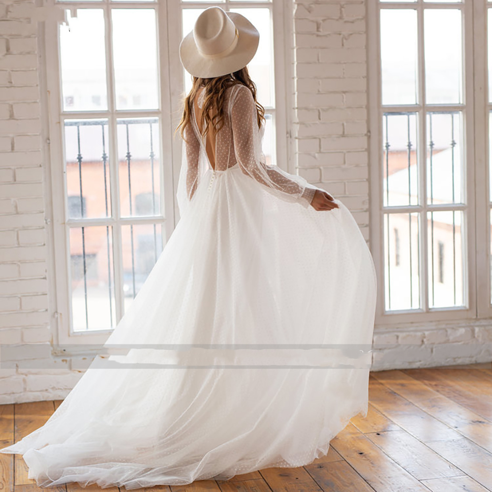 Boho Wedding Dresses Dotted Tulle Transparent Long Sleeve Backless A Line Bridal Gowns