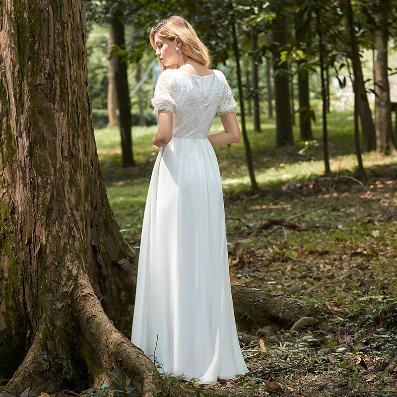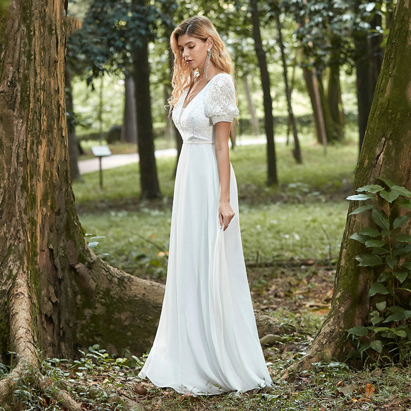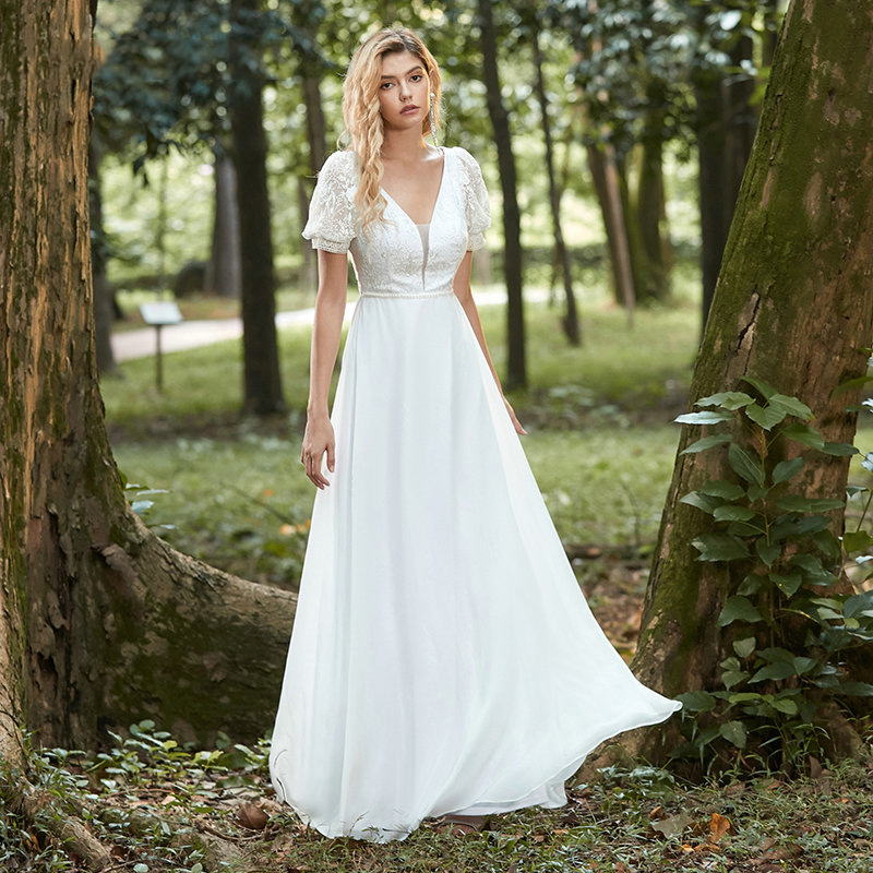A Line V Neck Wedding Dresses Short Sleeve Floor Length Chiffon Lace Vintage Elegant High Quality Wedding Dresses