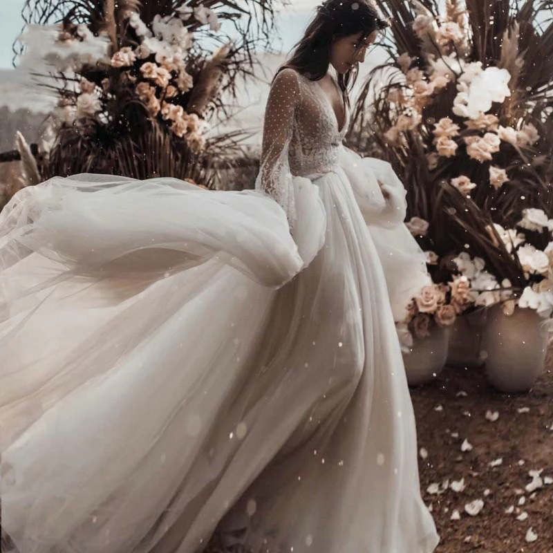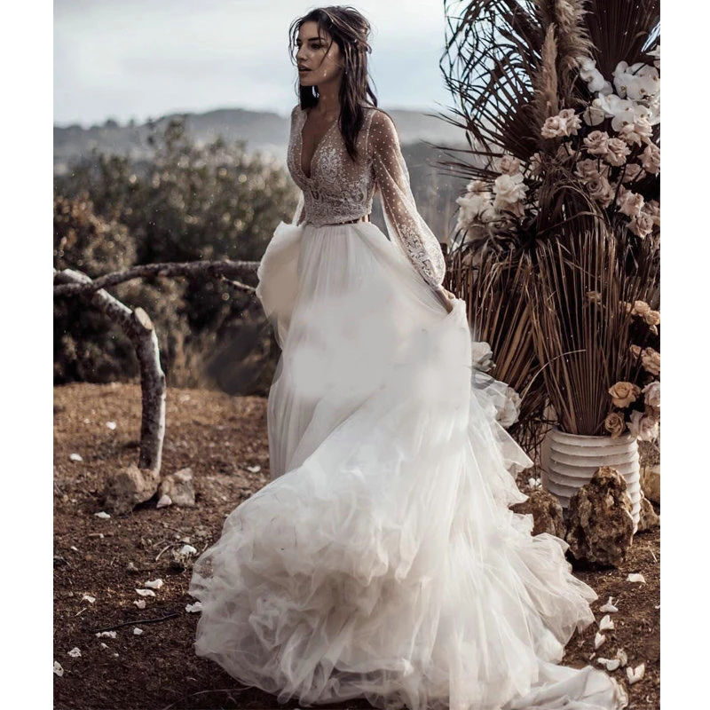 Boho Sexy Champagne V Neck A Line Wedding Dresses
