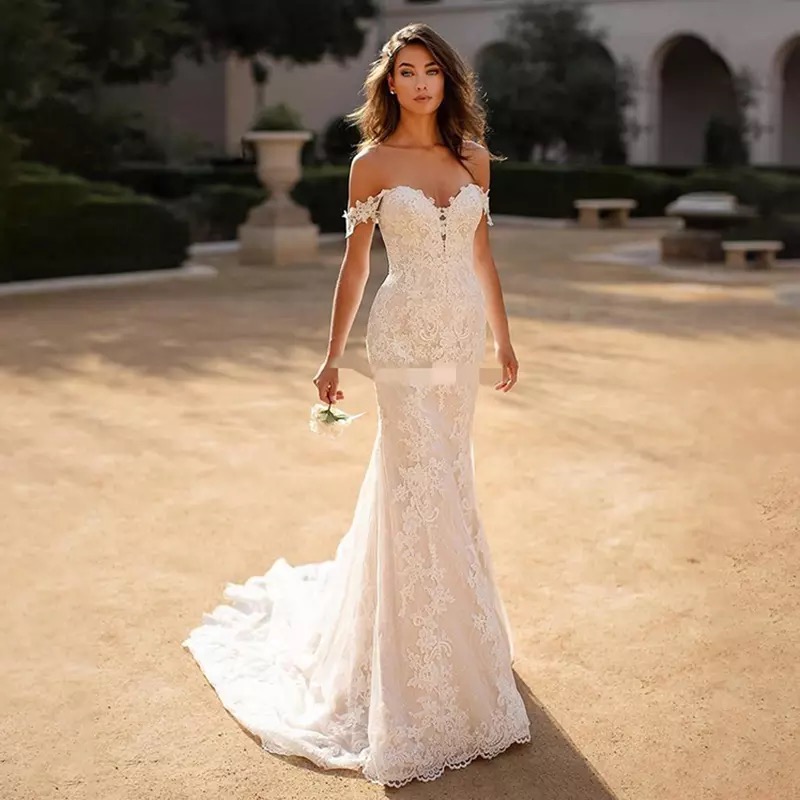 Light Champagne Mermaid Wedding Dresses Lace Appliques Bridal Gown