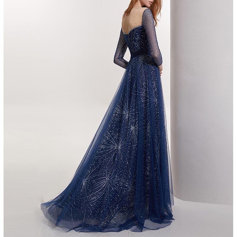 Stunning Navy Blue Evening Dress 3/4 Long Sleeves V and Zipper Back Sweep Train Prom Gowns