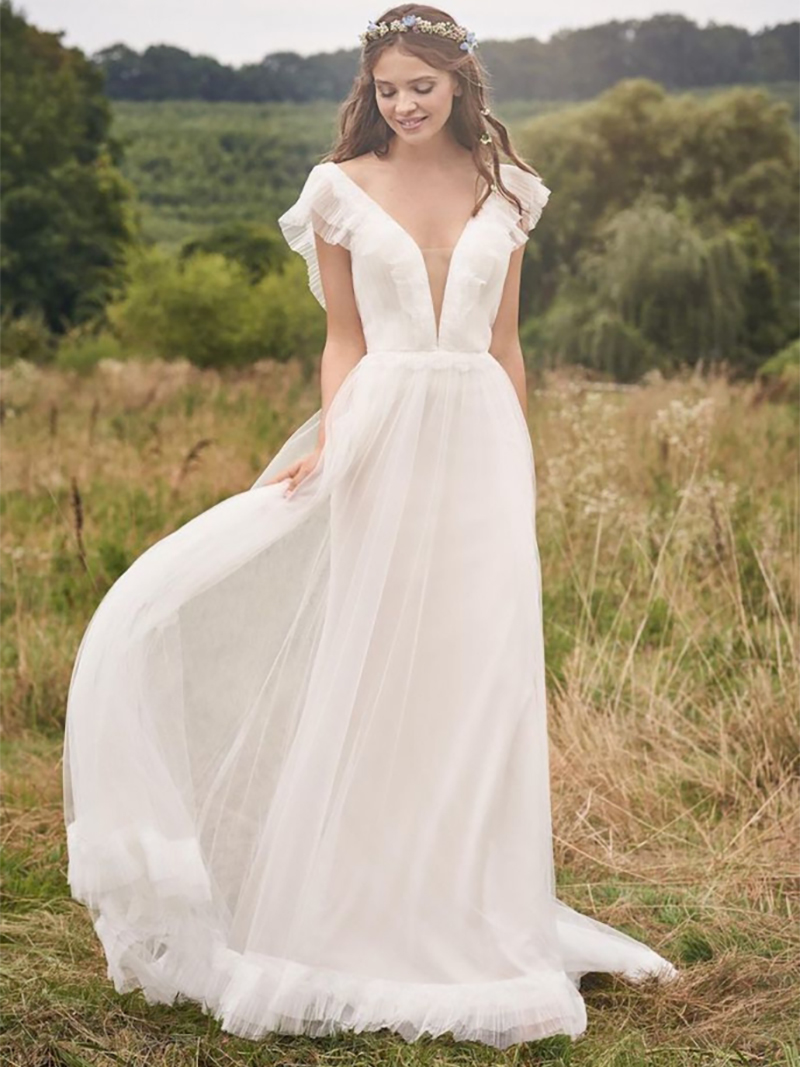 A Line Deep V Neck Custom Made Cap Sleeves Summer Backless Bridal Bridesmaid Gown