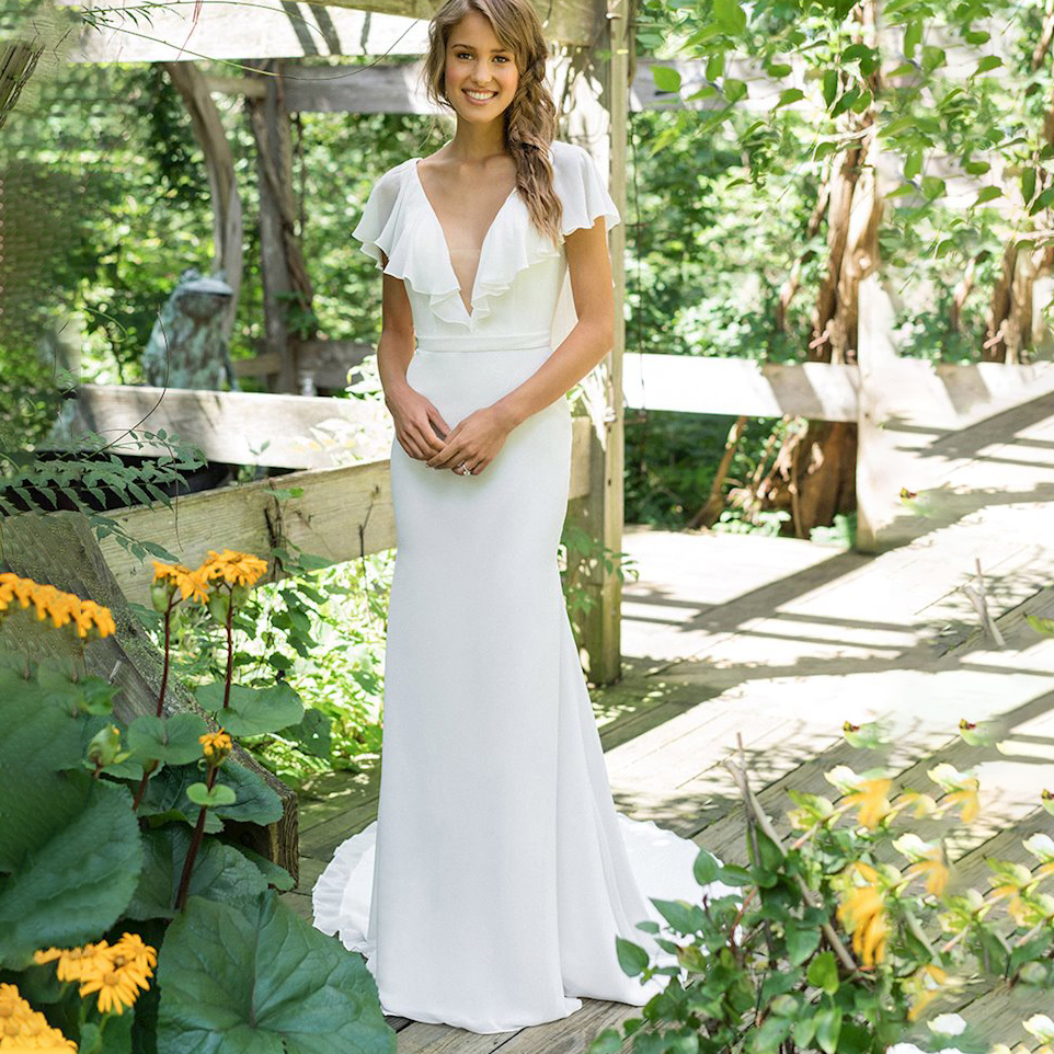 Chiffon Mermaid Short Sleeves Wedding Dress Deep V-Neck Cheap Backless Bridal Gowns