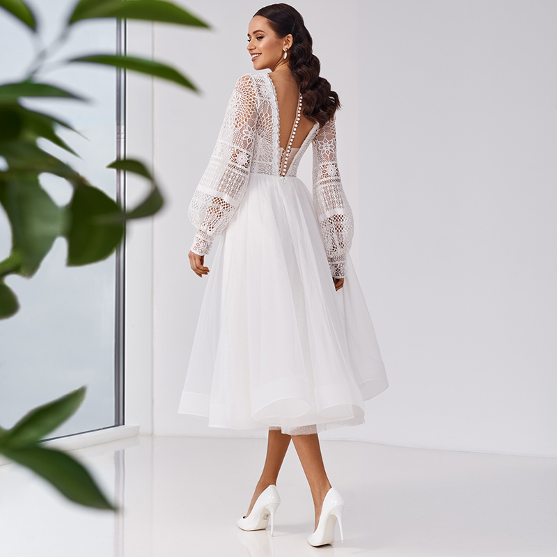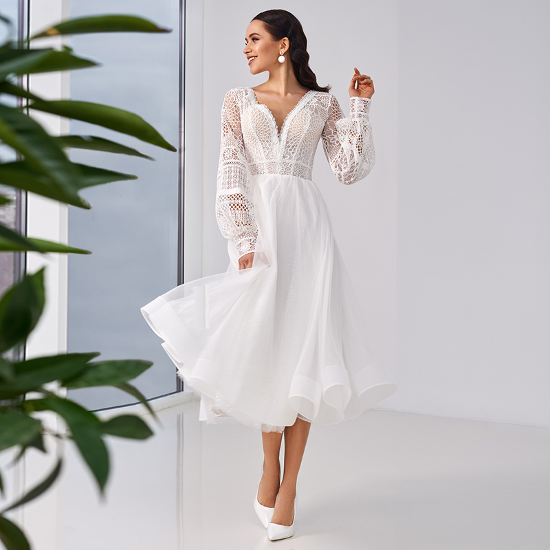 Tea Length V-Neck Wedding Dresses Lantern Long Sleeve Lace Boho Beach Short Bridal Gown
