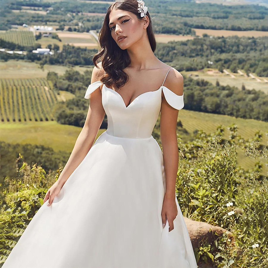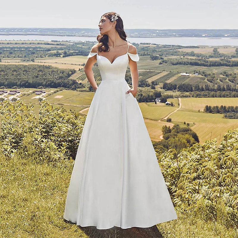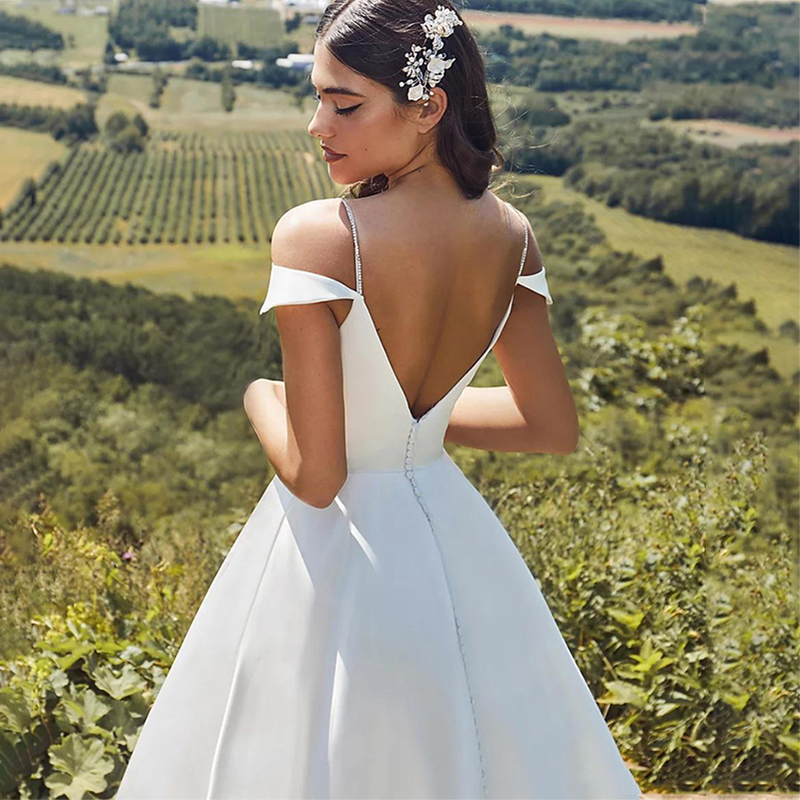 V Neck Satin Wedding Bridal Dress Spaghetti Straps Simple Open Back Bridal Gowns