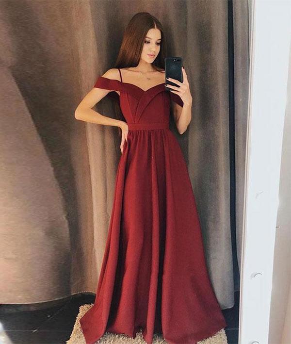 Burgundy Spaghetti straps Satin Prom Dress, Off the Shoulder A line Prom Dresses