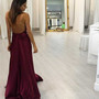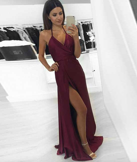 Burgundy V neck Halter Prom Dress, Backless Satin Split Prom Dresses