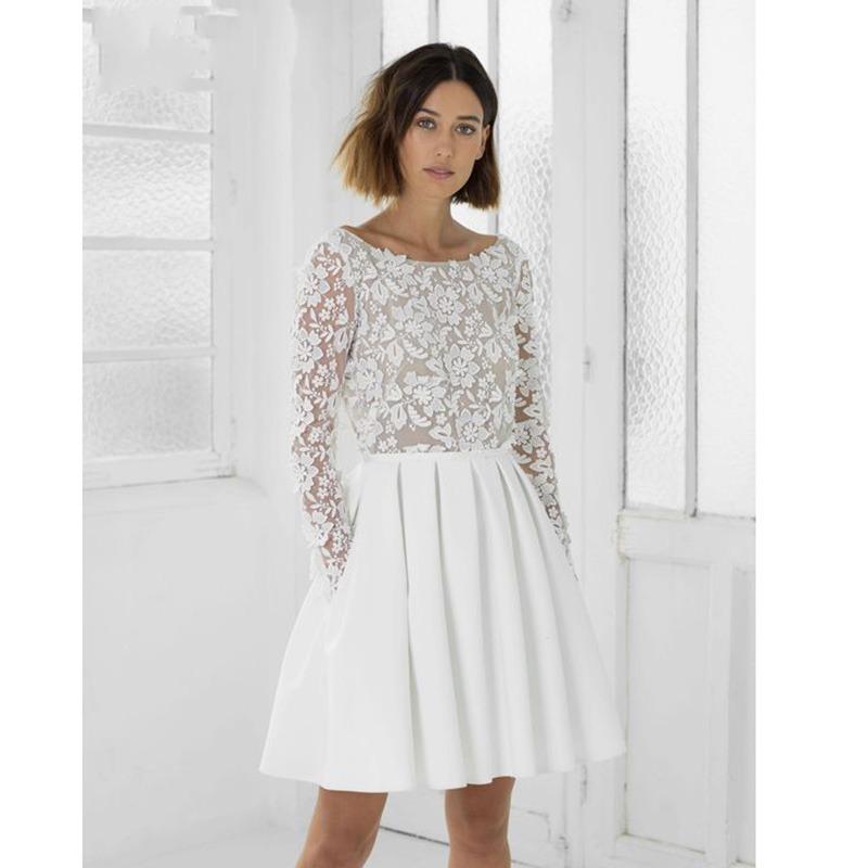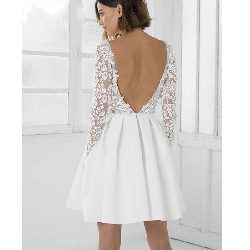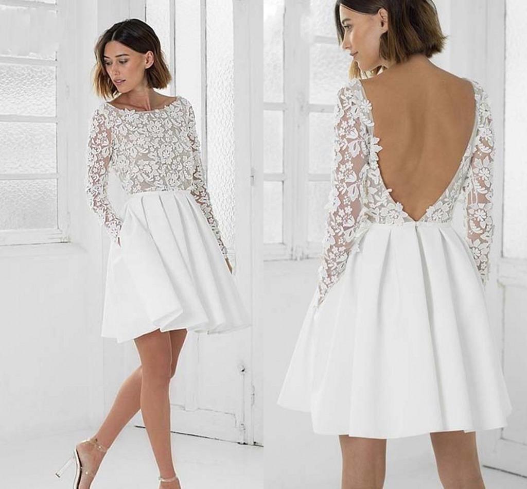 Backless Short Beach Wedding Dresses Boho Garden Scoop Neck Lace Long Sleeve Bridal Gowns