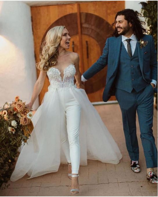 A Line Bridal Jumpsuit Wedding Dress with Detachable Train Lace Sweetheart Wedding Gowns
