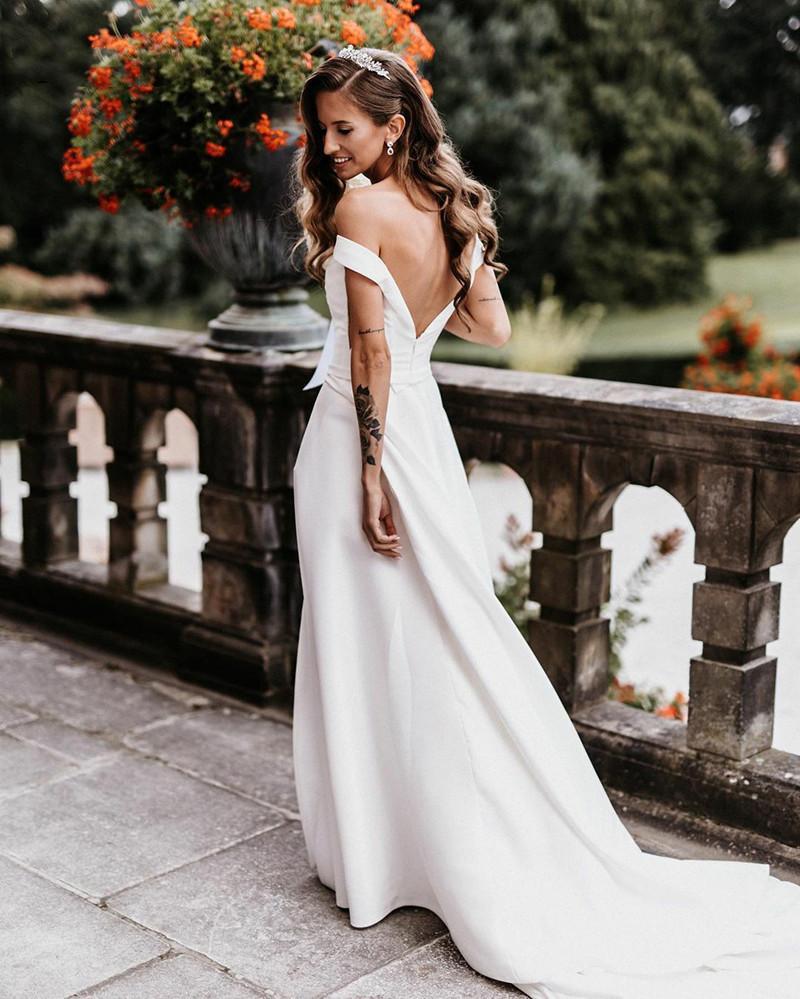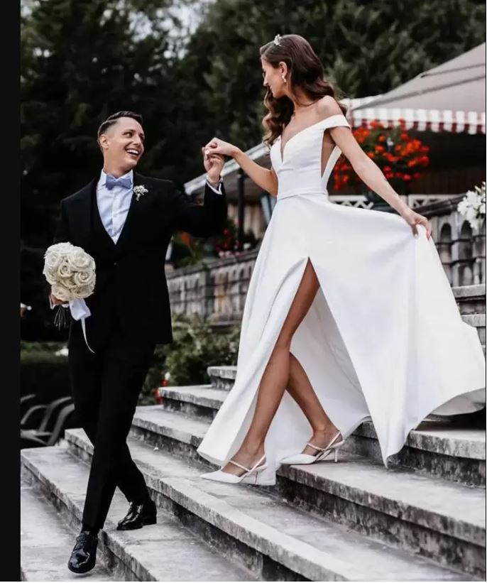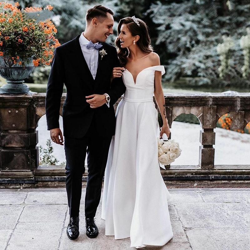 Charming Elegant Simple Satin Wedding Dresses Bridal Gowns Off The Shoulder Cut Side Plus Size Lady Marriage Second Reception Dresses