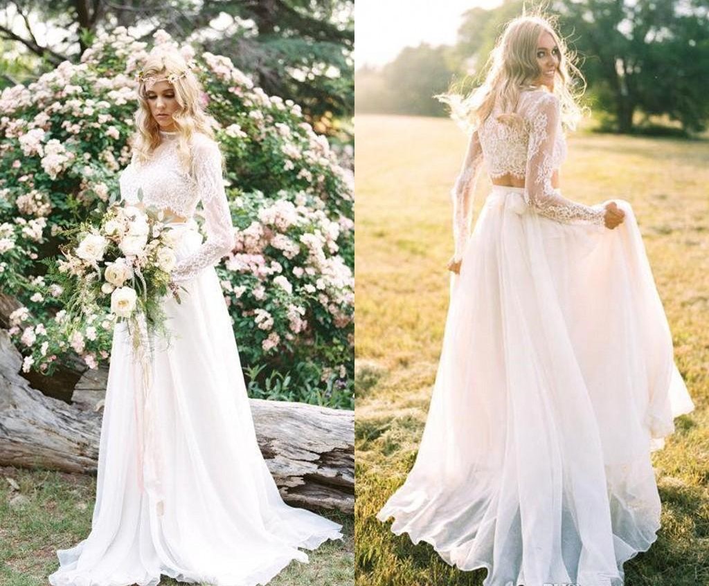 Cheap Two Piece Bohemian Country Wedding Dresses Lace Long Sleeves Summer Beach Bridal Gowns