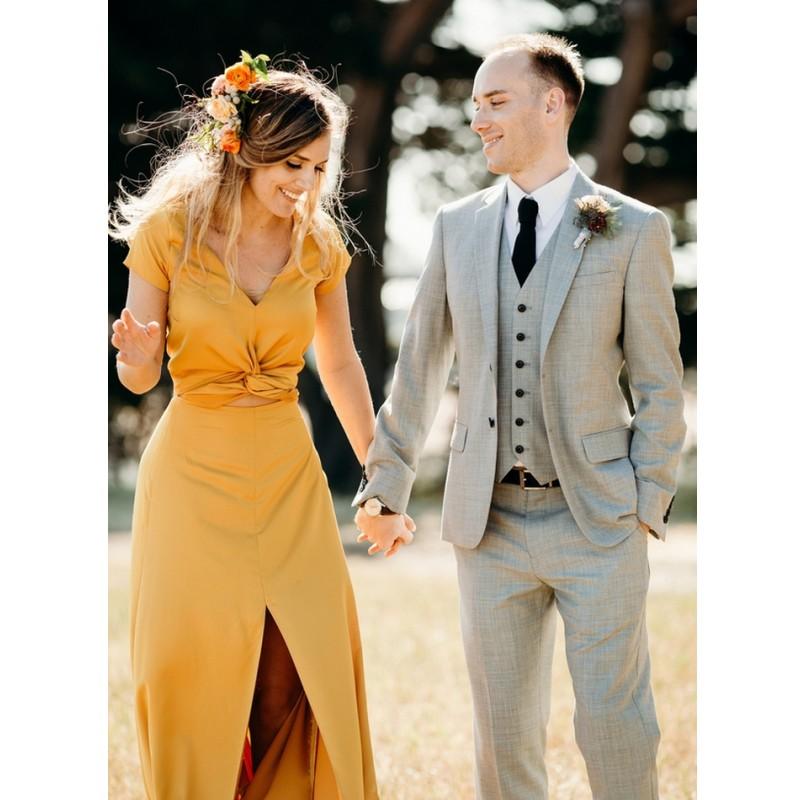 Autumn Gold V Veck Country Wedding Dress Chic Slit Front Long Bridal Gowns With Short Sleeves