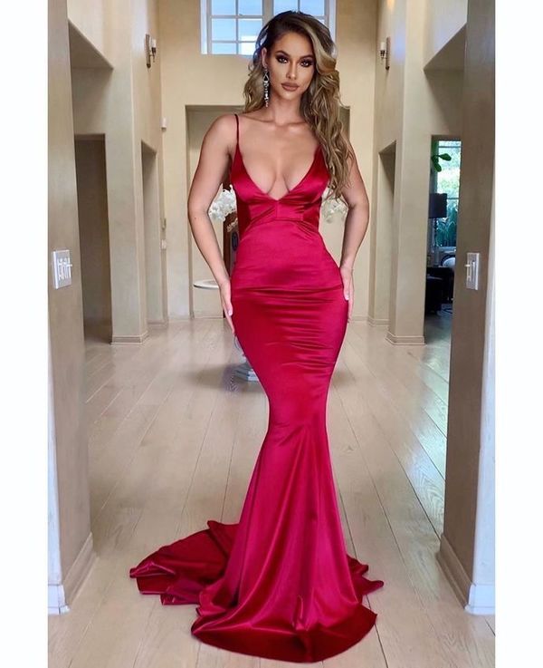 Hot Sexy Mermaid Deep V Neck Red Long Prom Evening Dress