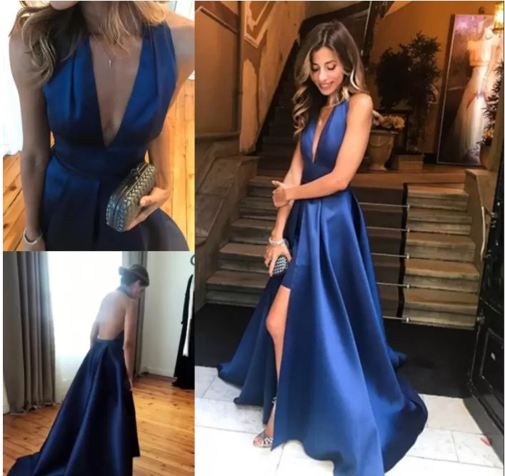 Pleats Halter Neck Prom Dresses Sexy Front Split Sleeveless Satin Sweep Train Evening Dress New Arrival Cheap Long Formal A-Line Party Dress