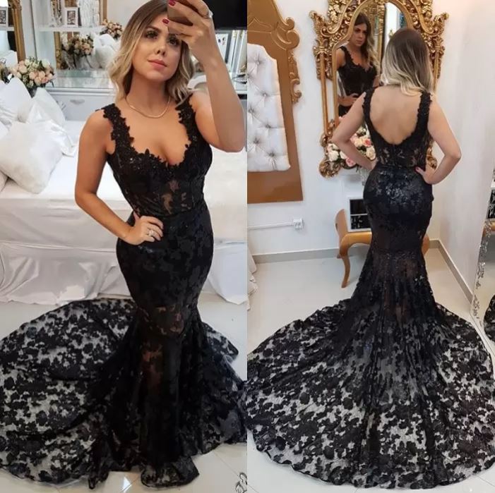 Sexy Mermaid Black Lace Long Prom Dresses V Neck Backless Sweep Train Formal Party Dress
