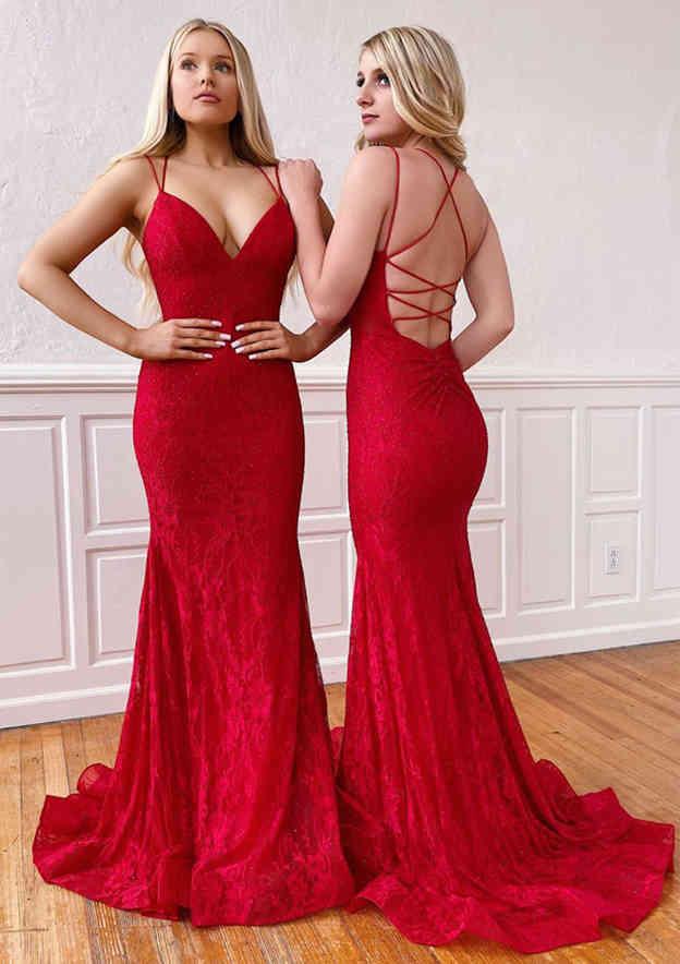 Sexy Mermaid Red Lace Long Prom Dresses Spaghetti V Neck Backless Sweep Train Evening Gowns