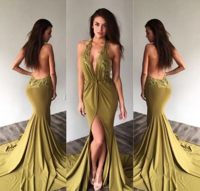 Sexy Split Backless Prom Dresses Halter V-Neck Sequins Applique Court Train Party Dress Cheap Stylish Mermaid Satin Evening Gowns