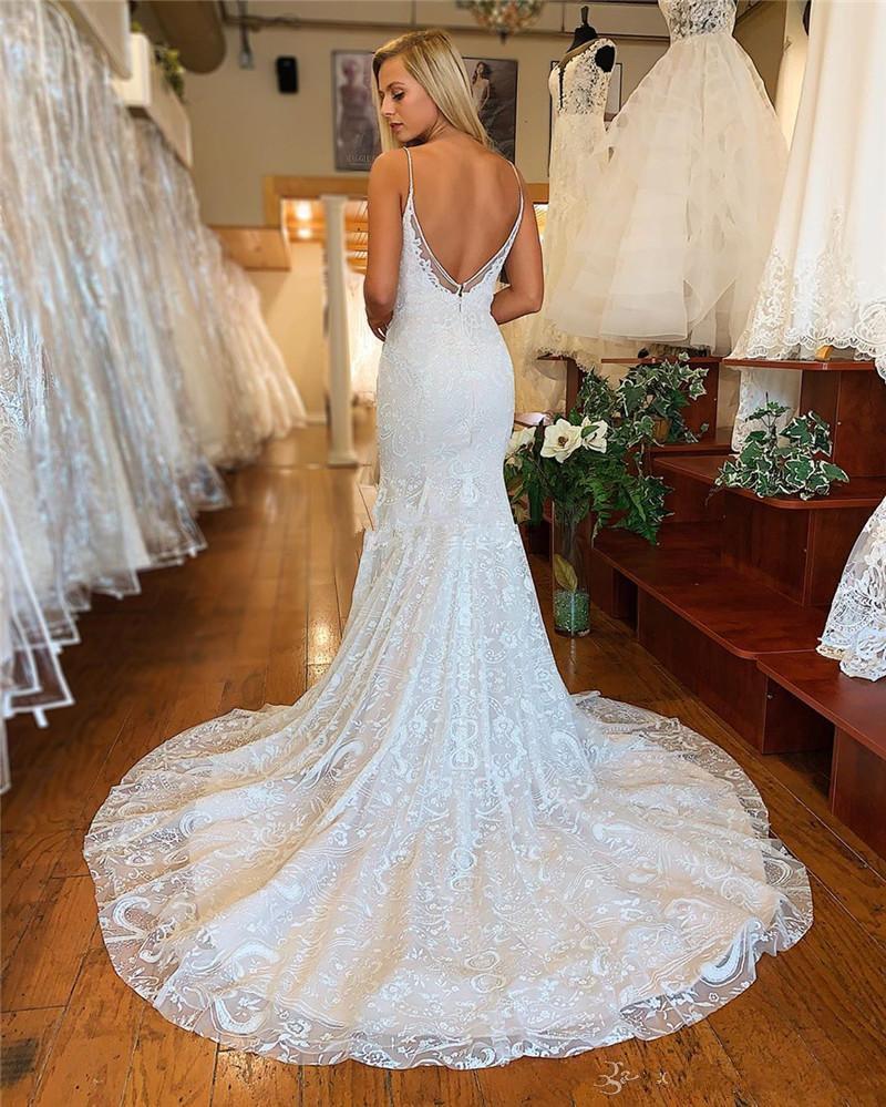 Elegant Backless Mermaid Wedding Dresses Spaghetti Straps Lace Applique Sweep Train Custom Made Wedding Bridal Gown