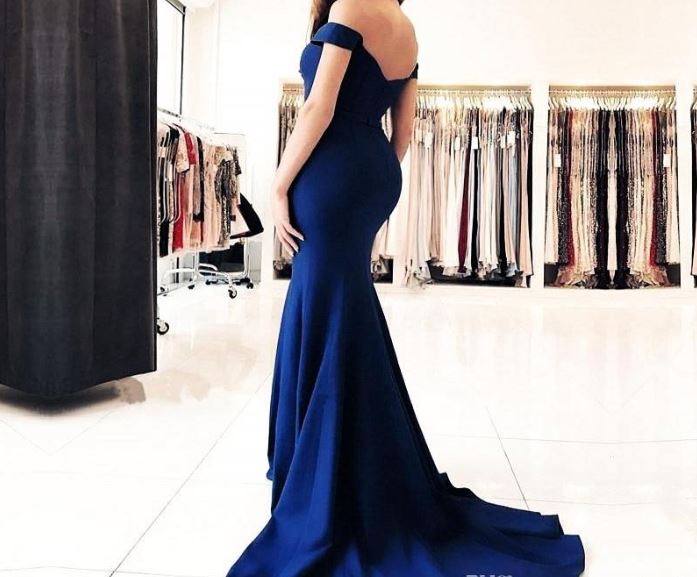 Navy Blue Satin Mermaid Long Prom Dresses Elegant Off The Shoulder Bow Sash Simple Sweep Train Formal Evening Gowns
