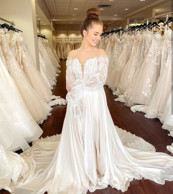 wedding dress long sleeve with train stain lace appliques bridal gowns