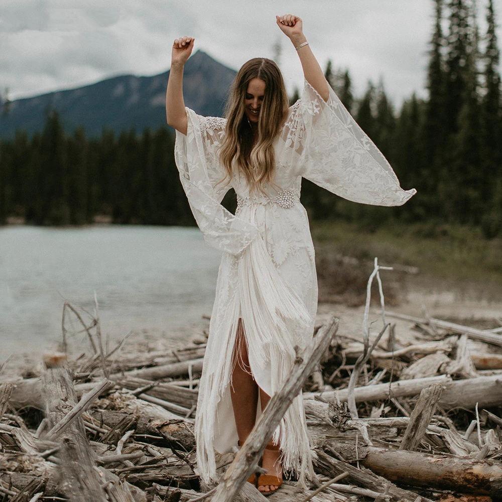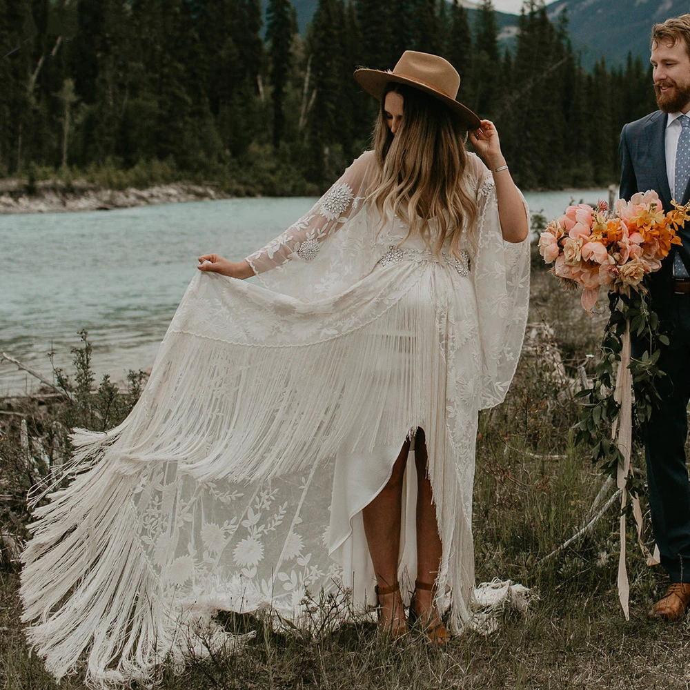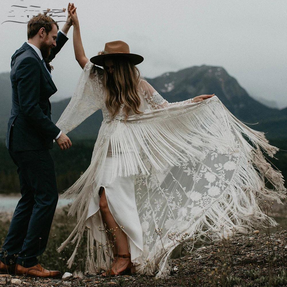 Flare Long Sleeve Boho Wedding Dresses Fringes Bohemian Bridal Gowns Tassel V Neck Lace
