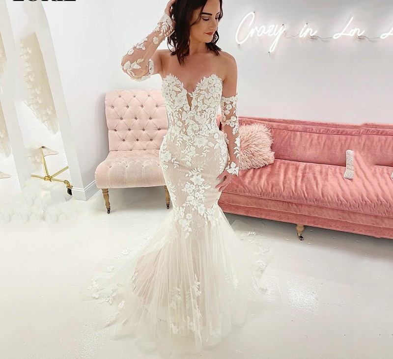 Lingt Long Sleeve Mermaid Wedding Dresses Sweetheart Lace Appliques Ivory Bridal Gowns