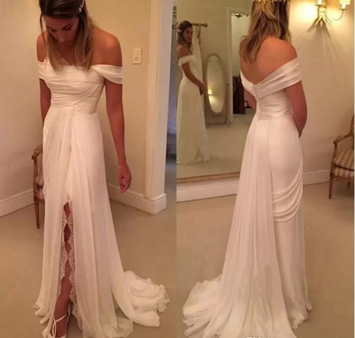 Simple Chiffon Beach Wedding Dress with Lace Slit Strapless Off The Shoulder Long Ruched Sweep Train Empire Plus Size Wedding Gowns