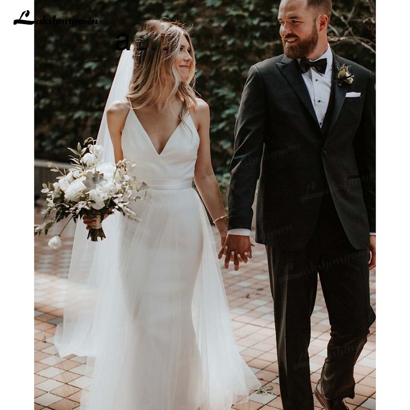 Simple Wedding Dress with Detachable Tulle Skirt Satin V Neck Backless Spaghetti Straps Bridal Gown